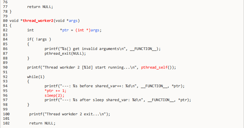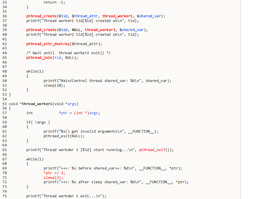 调度策略。当然因为代码45行处主线程调用了pthread_join会导致主线程阻塞,所以主线程不会往下继续执行while(1)循环。我们再来深入分析各个线程的代码: