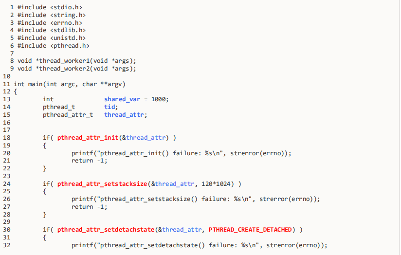 代码15行我们定义了创建线程的属性变量thread_attr ,在对该属性进行设置前,我们需要先调用pthread_attr_init 函数初