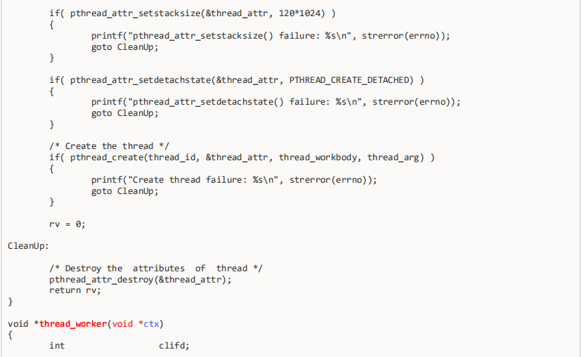 始化它(第18行),在第24行我们设置线程的栈大小为120K,同时在第30行设置线程的属性为分离状态。第36行创建线程时使用了该属性创建线程,这时创建的子进程就是分离状态了。线程属性在使用完之后,我们应该调用pthread_attr_destroy (第42行)把他摧毁释放。