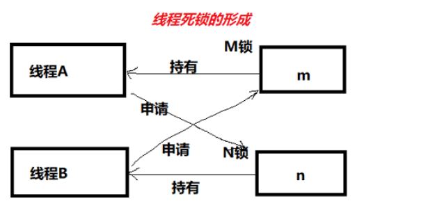 m和n,同时每个变量都有自己相应的锁M和N。 这时A线程首先拿到M锁访问m,接下来他需要拿N锁来访问变量n; 而如果此时B线程拿着N锁等待着M锁的话,就造成了线程“死锁”。