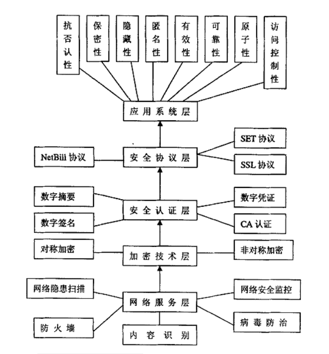 网络服务层、加密技术层、安全认证层、交易协议层、应用系统层组成。