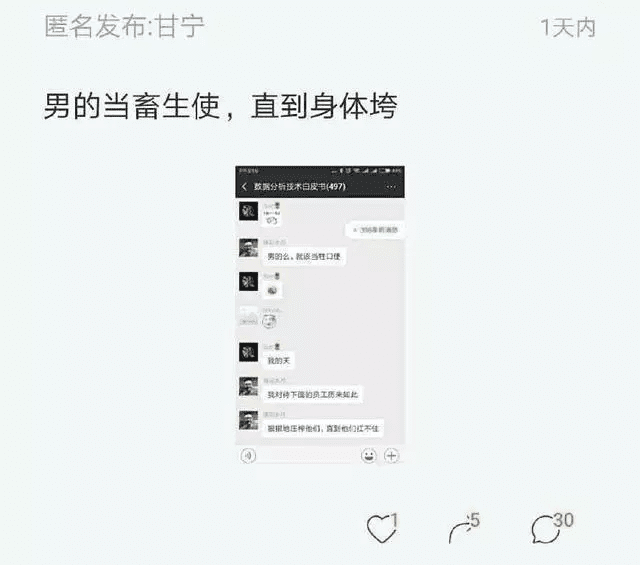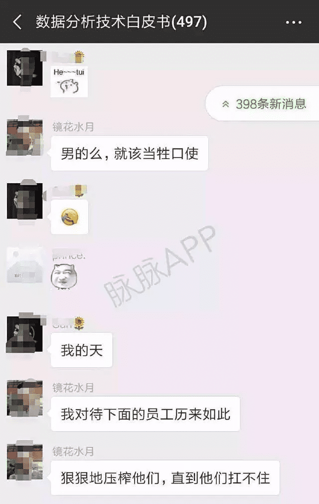在这个名为数据分析技术白皮书的微信群内,聚集了497位群友,据网友透漏,绝大部分都是互联网公司高管或者技术人才。在谈到员工加班这个问题时,一位名为“镜花水月”的群友说了这样一句话:男的么,就该当牲口使。在其他群友表示诧异和惊讶之后,其继续在群内炫耀自己领导有方,并发表高见:我对待下面的员工历来如此,狠狠地压榨他们,直到他们扛不祝