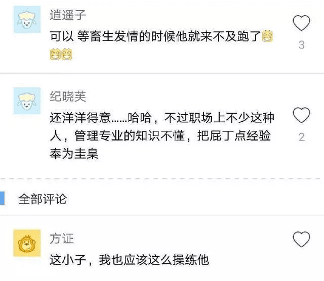 对于这名领导的发言,广大网友都表示很愤慨,特别是在互联网公司工作的网友,有网友直言:这个人,看头像我就想打他一顿,建议八一八他;还洋洋得意,这种人在职场上还不少,管理专业的知识不懂,把屁点经验奉为圭皋云云。
