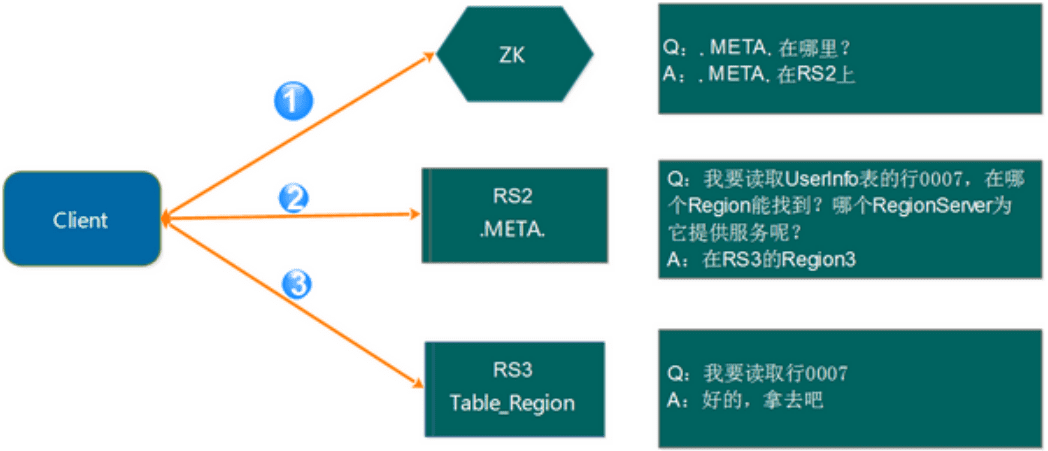 第 3 步:Client 请求.META.表的 RegionServer 地址,获取访问数据所在RegionServer 的地址, Client 会将.META.的相关信息 cache 下来,以便下一次快速访问