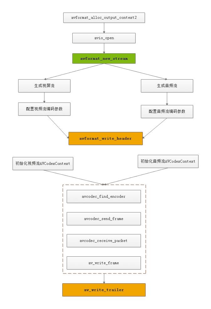 上图红框里的流程视频编码和音频编码都是一样的,循环处理直到把所有需要编码的数据处理完,然后退出,接着调用av_write_trailer写入尾部文件信息。