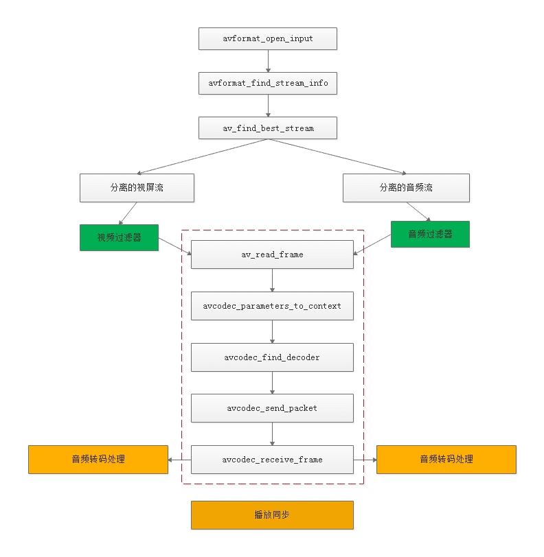 从上图看到有两个关键功能点:解码后过滤器对数据的过滤处理;音视频播放时同步策略。