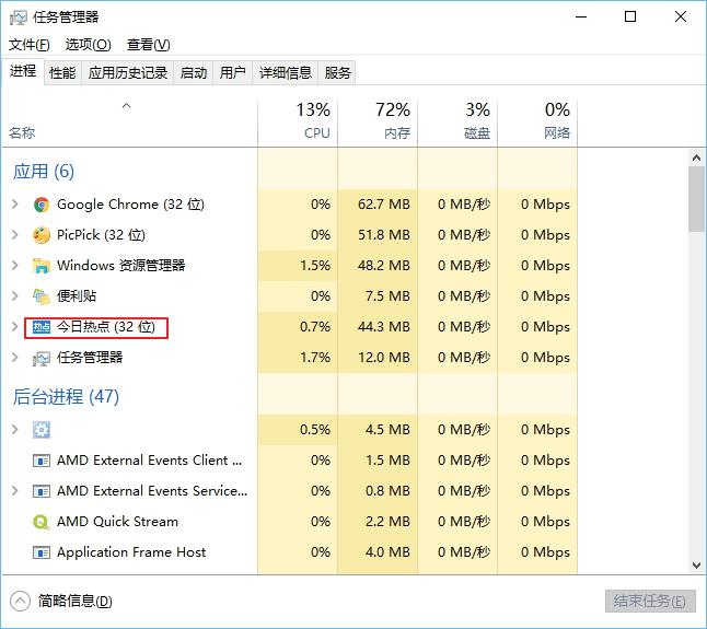 1. 当它弹出来的时候不要急着关闭,先按快捷键【ctrl+alt+delete】打开任务管理器,可以看到今日热点的进程。