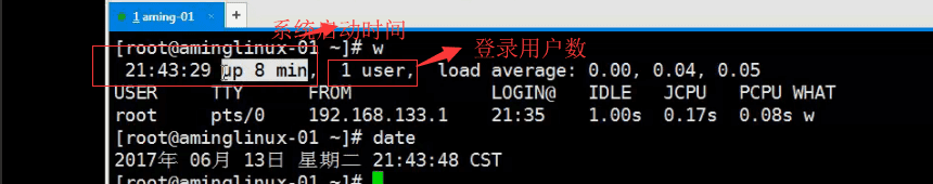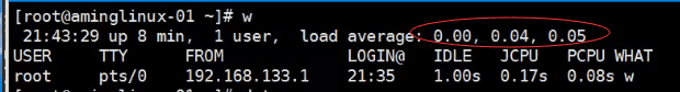 w/uptime 查看系统负载:第一行从左到右显示的信息依次为:时间、系统运行时间、登录用户数、平均负载。