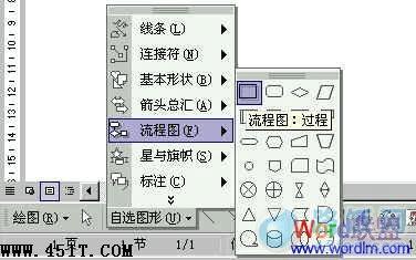 1、单击“绘图”工具栏上的“自选图形”,然后选择“流程图”,这里就可以看到众多制作流程图时所用到的形状了,大家可以选择自己喜欢的的形状;