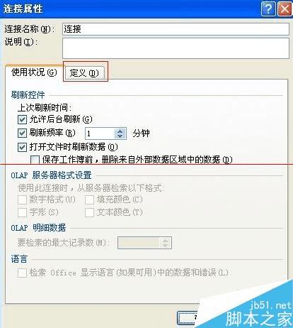4、接下来是“连接属性”对话框,找到途中所示的“定义”,点击打开;