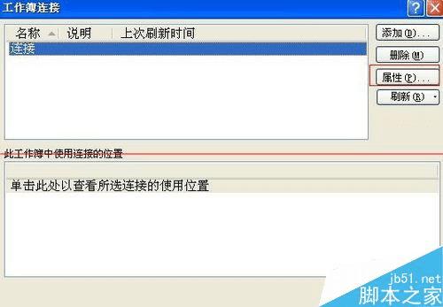 3、在出现的“工作簿连接”对话框,找到右侧的“属性”,打开;
