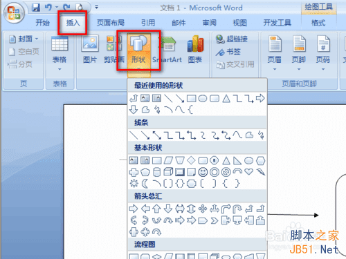 1、选择功能区中的“插入”,在“插图”功能中选择“形状”,选择一个图形,在文档空白处点击鼠标左键,图形就被放置到该处。其它图形也这样选择。