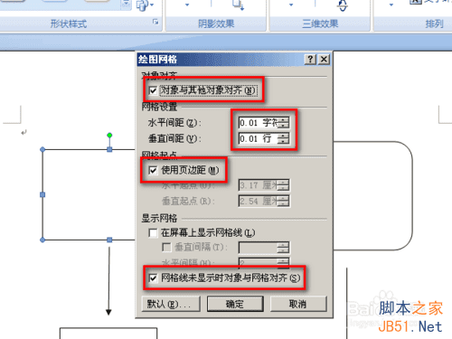 3、在打开的“绘图网格”窗口中,选中“对象与其他对象对齐”、“网络线未显示时对象与网格对齐”这两个选项。在“网格设置”中将“水平间距”和“垂直间距”的数值设为最小值0.01。点“默认”,从这以后打开的文档使用的都是这个设置。然后,确定,设置完成。