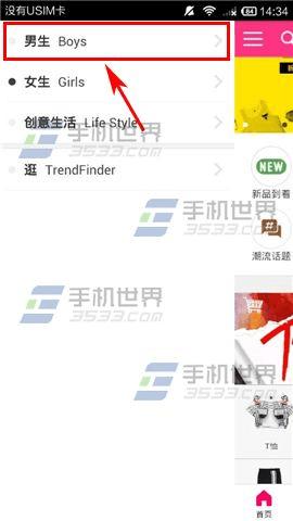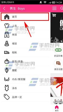 2)然后选择【首页】,即可切换到男生商城首页啦,如果点击其他商品类型的话则切换到商品类型页面哦。(如下图)