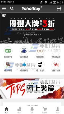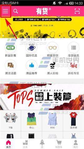 1)打开YOHO有货,进入首页后,目前是女生商城,点击左上角的【三】按钮,弹出菜单栏,点击【男生】。(如下图)