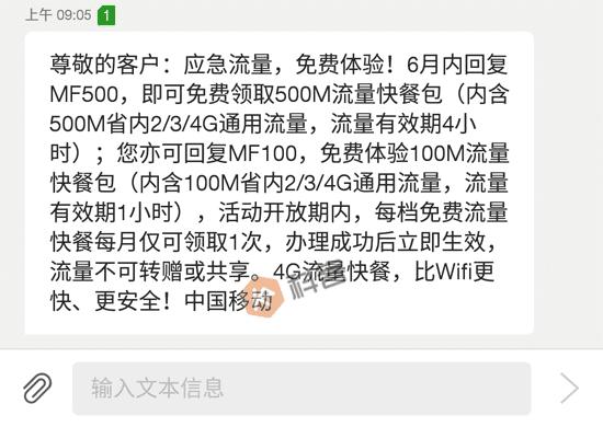 另外如果回复“MF100”,可以获得100MB流量,有效期仅仅1个小时。