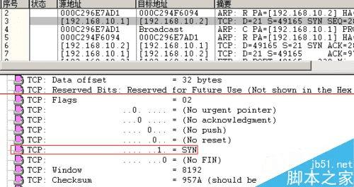 4、用PC1访问PC2之后,用Sniffer抓包分析出第一次握手SYN值为1