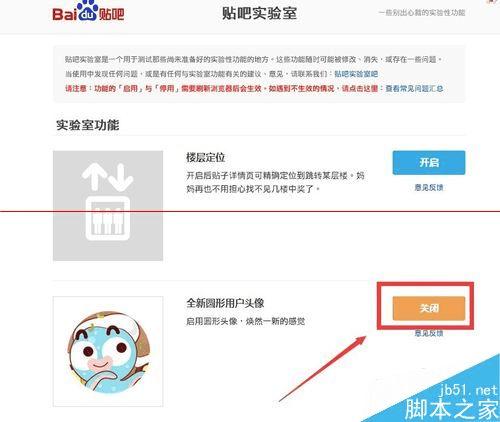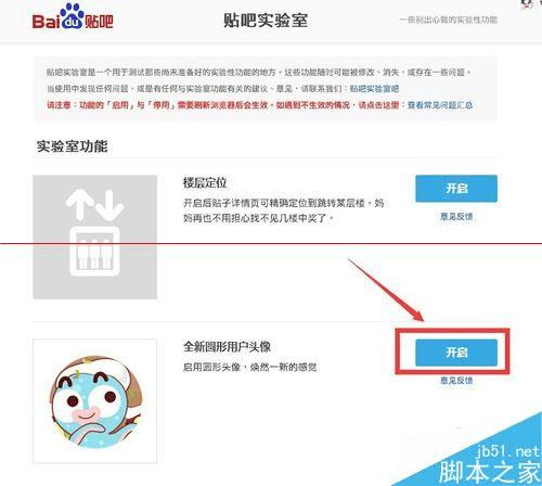 5、接下来就进入到了贴吧实验室,然后点击全新圆形用户头像后面的开启,如图所示