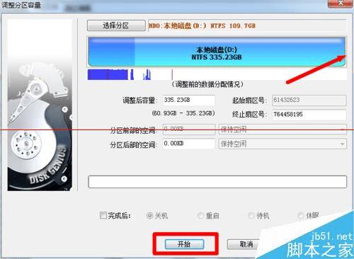4、此时将弹出“调整分区容量”窗口,在此界面中拖动分区容量,将两个相邻分区合并成一个分区,点击“开始”按钮以合并分区。