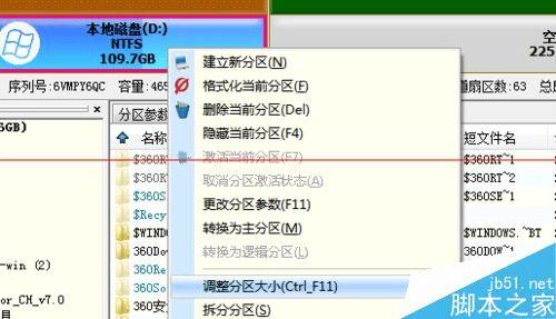 3、接着右击与已删除分区相邻的其它分区,从弹出的右键菜单中选择“调整分区大小”项。