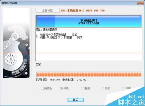 5、将下来“DiskGenius”工具将检测分区的错误,同时完成两个分区的合并操作。如图所示,最后点击“完成”按钮。