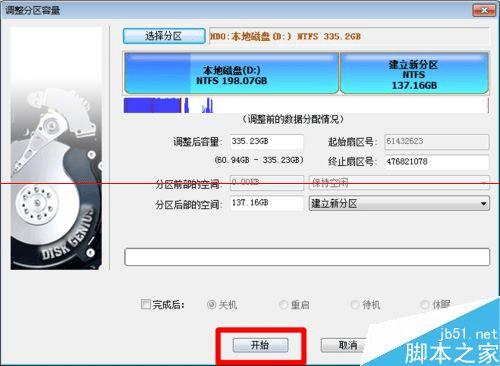 7、从打开的“调整分区容量”窗口中,根据实际使用情况进行合理的分配,点击“开始”按钮即可自动分割两个分区操作。