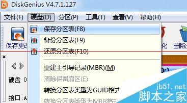 2、接着点击“硬盘”菜单项,从弹出的下拉菜单中选择“保存分区表”项,以实现保存当前分区表信息。