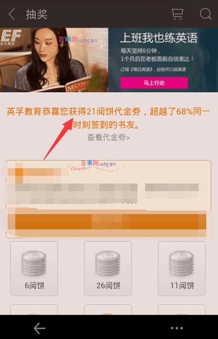 单击之后如果有抽到阅饼的话就会显示抽到多少阅饼代金券。