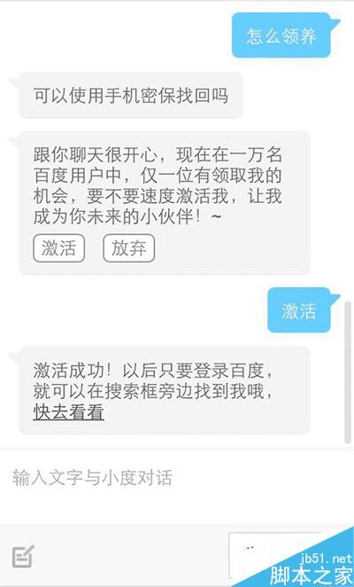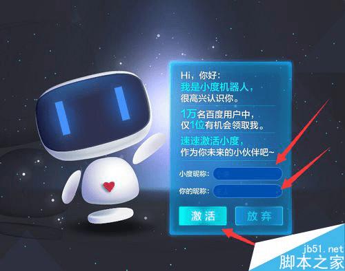 之后就百小度机器人就出现了,填写TA的昵称,和你让TA叫你什么的昵称,点击“激活”就领养成功了。