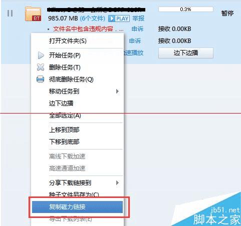 1、在迅雷中右键点击所下载文件/种子均可,点击【复制磁力链接】