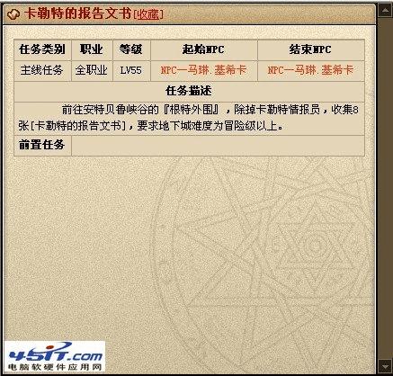 任务简介 前往安特贝鲁峡谷的[根特外围],除掉卡勒特的情报员,收集8张[卡勒特的报告文书],要求地下城难度为冒险级以上。