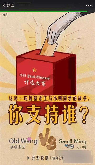 我再举一个例子,五一劳动节的时候,我们做了一个H5的小游戏,叫做"互联网劳模评选",就是在"隔壁老王"、"小明同学"、"广场舞大妈"、"卖面膜的"等候选人中评眩其实暴风自己的流量足够,但是我们为了保险,想请几个大号帮我们转发一下,后来几个大号报价都是几万几万的,我就问负责这个事的同事,如果是花五万,你能保证1000个转发吗?答案是保证不了。