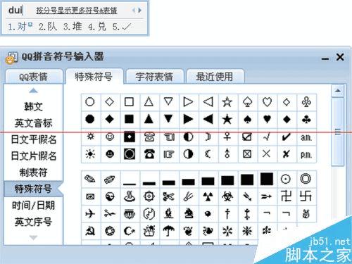 5、打开符号输入器窗口后要选择“特殊符号”选项,进入后,再选择左侧类别中的“特殊符号”,从显示结果中找到符号,点击就输出了。