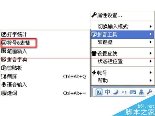 4、在输入法状态栏上点鼠标右键,在弹出的菜单中选择“拼音工具”中的符号和表情,同样可以显示“特殊符号”选项。