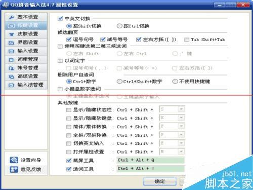 1、在输入法状态栏上按鼠标右键,在弹出的菜单中进入“属性设置”,进入“按键设置”,可以发现输入法没有进入特殊符号选项的快捷键。所以要用其它方法进行选择。