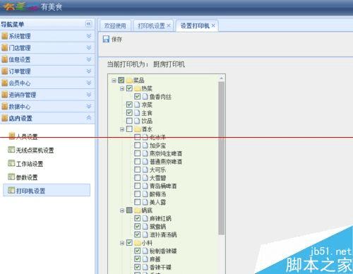 勾选后厨打印机,点击打印机设置,点击菜品打印机,勾选所有在后厨出的菜,如热菜、凉菜、锅底等,点击保存。
