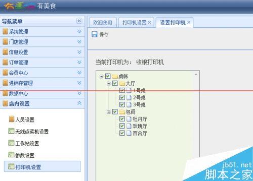 第五步:选择桌账打印机设置,分别点击划菜单、预结单以及结账单,勾选全部内容,点击保存。