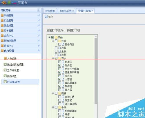 选择菜品打印机设置,勾选应在前台出的菜品,如饮品,点击保存。