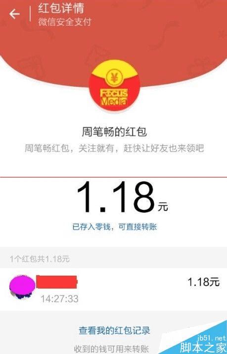 3、关注成功,第一时间接到公众号发送的消息,点击“领取现金红包吧”。随即窗口提示领取到的金额,这里1.18.可以返工到我的零钱包中查看该红包哦。