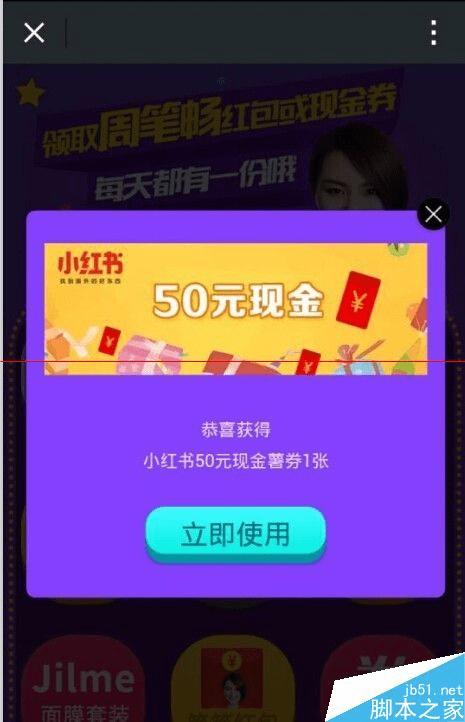 4、另外,也可以点击“天天抢红包”,在打开的抢红包窗口中,点击“抢”----窗口提示结果。这里抢到了一款优惠券现金红包。可点击“立即使用”。