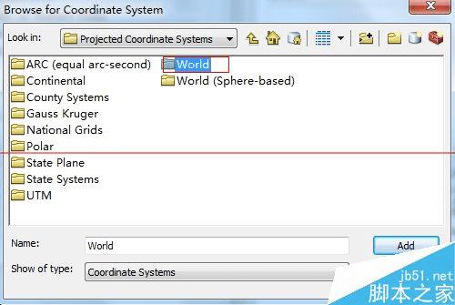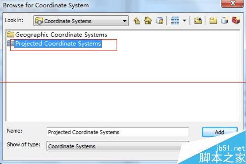 6、找到WGS1984 Web Mercator.prj,点击“Add”,如下图所示: