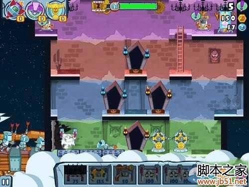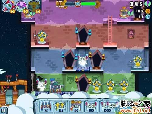 游戏开始后面我们发现前4层只有第1层的入口可以进攻,于是我们就重点防御第1层。在第1层放上2个地刺,1个并冬季和1台连弩就可以了。