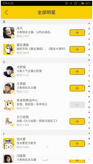 点击左上角的“+”,你将看到全部的明星,你可以在这里选择喜欢的,进行关注。比如小乐哥就关注了“单身狗救治中心”……你懂的。