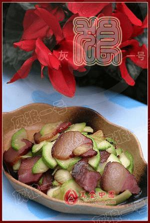 3、锅中油热后,倒入葱蒜爆香,然后倒入腊肉翻炒片刻后下西葫芦,炒熟即可