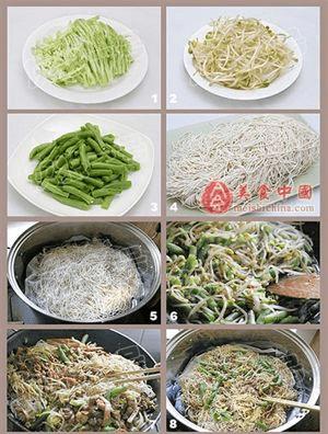 5、肉炖熟后,依次加入豆角、香菇和泡好的土豆粉翻炒至熟,加盐炒匀即可出锅。