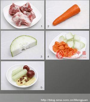 3、砂锅中加水,放入棒骨,大火烧开后,加入葱段,生姜,花椒、料酒以及红枣,中火慢炖40分钟(每家的火力不同,请调整)后加入冬瓜和红萝卜块炖至棒骨以及菜熟,加入适量盐即可!