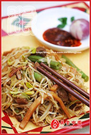 6、将刚才放凉的面条加入炒锅,关火。然后将锅中所有的材料搅拌均匀;
