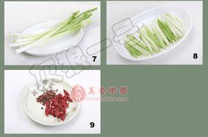 此步骤注意蒜苗的切法:切勿用刀乱跺,要用针(刀亦可)将蒜苗从叶子到茎划成细丝,再用刀切细,最后切成非常小的近似正方形;
