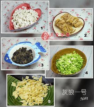 1、豆腐切丁(图1),黄花菜泡发切段(图2),木耳泡发切丁(图3),鸡蛋摊成薄鸡蛋切成豆腐丁大小的菱形(图5),蒜苗切成如图4的碎末;