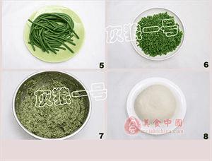 2、豇豆择净,放滚水中焯至变色,捞出立即过冷水使其保持碧绿,稍微控水后切碎,加入肉馅中;